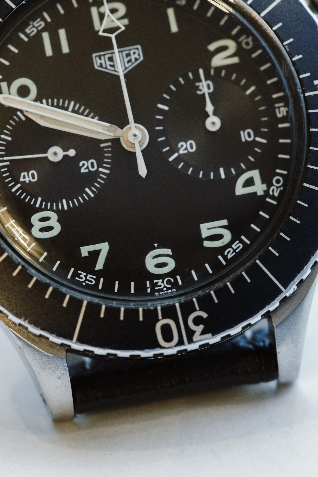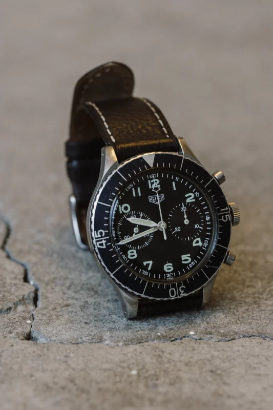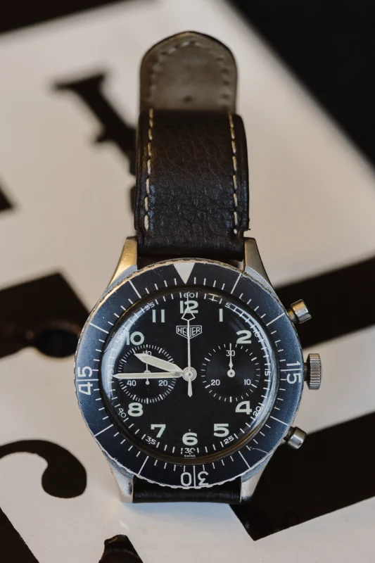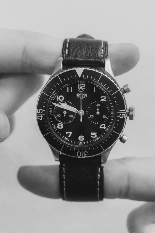 There are various variants of this watch, and the differences are of course in the details on the dial. Specifically, this model has the so-called. T-only dial, which can be seen when you take a closer look at the watch. It is robust and durable, and with a diameter of 43 mm and a thickness of 13 mm, it sits perfectly on the wrist. The watch is adorned with a very high-quality, and perhaps the best chronograph mechanism of its time – Valjoux 230 s flyback function. If you are wondering what is the difference between a chronograph and flyback chronograph, the difference is that with a regular chronograph caliber the mechanism must be stopped before it can be reset, while with flyback A chronograph mechanism can be reset while it is still running, making it particularly useful for measuring successive events at short intervals. Heuer The 1550SG is a watch that speaks volumes, and over time it has become an icon of pilot's watches.